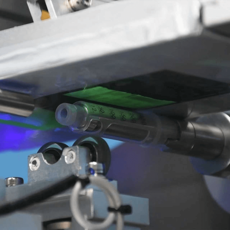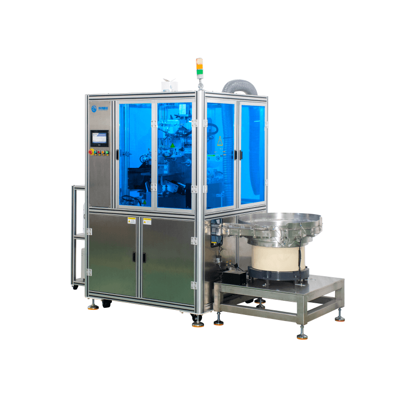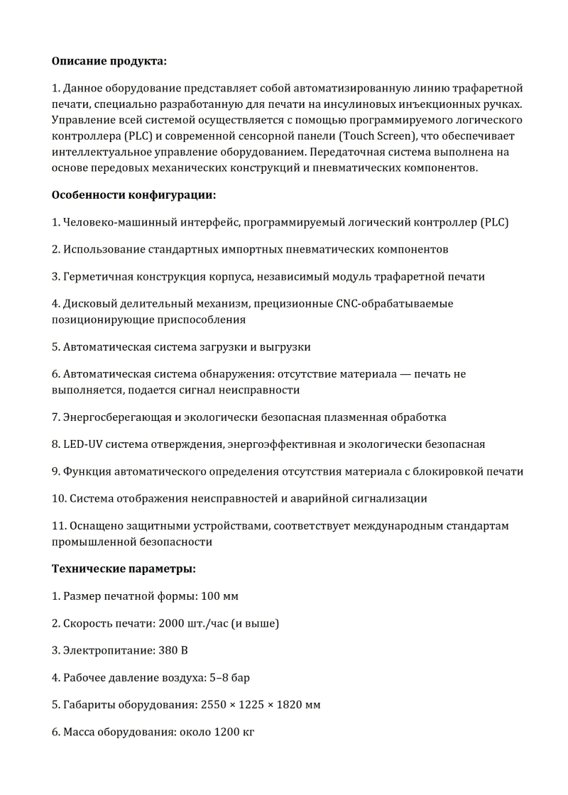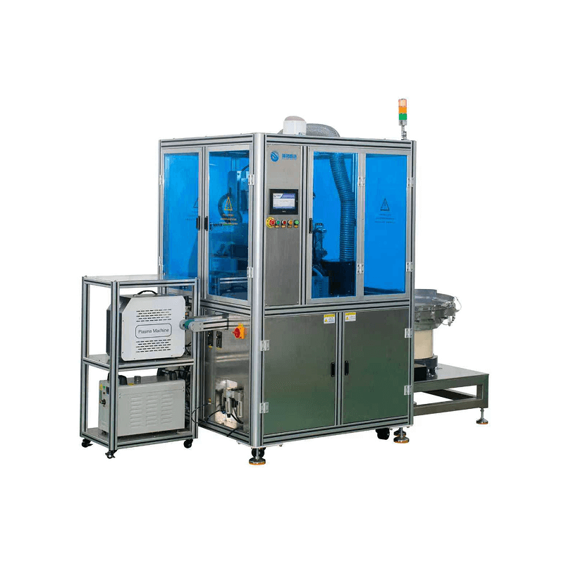 Производственная линия выполнена в дисковой автоматической конфигурации и объединяет в себе вибрационную ориентацию изделий, автоматическую подачу, поверхностную плазменную обработку, шелкотрафаретную печать, LED-UV отверждение, лазерную маркировку поверхности и автоматическую выгрузку, образуя полностью интегрированную систему.